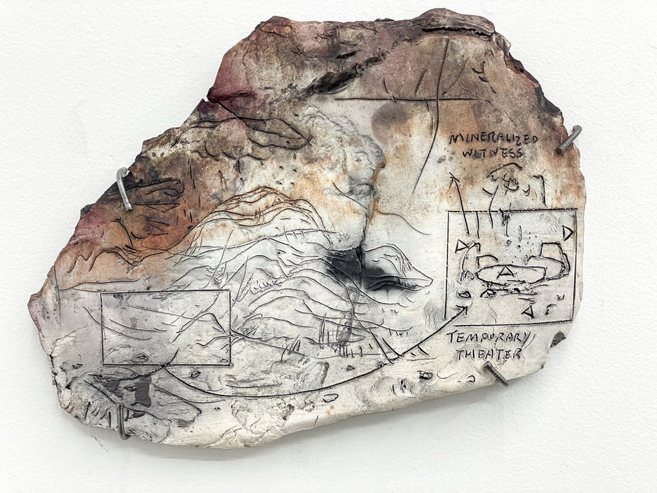 The work consists of a series of diagrammatic drawings and writings on porcelain clay tablets depicting the artists’ field work process in the American Southwest.